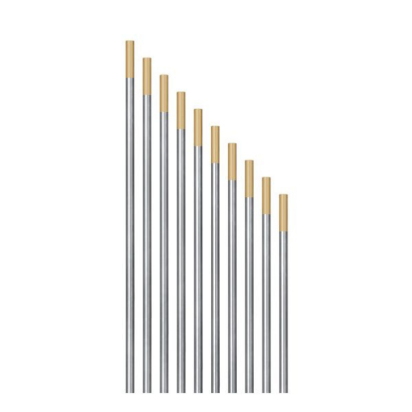 Électrode tungstène TIG “Gold” (1,5% lanthane), longueur 175 mm, pour soudage DC sur acier et inox. Arc stable, amorçage facile et excellente durabilité.